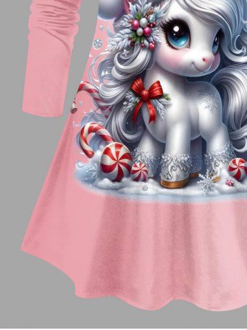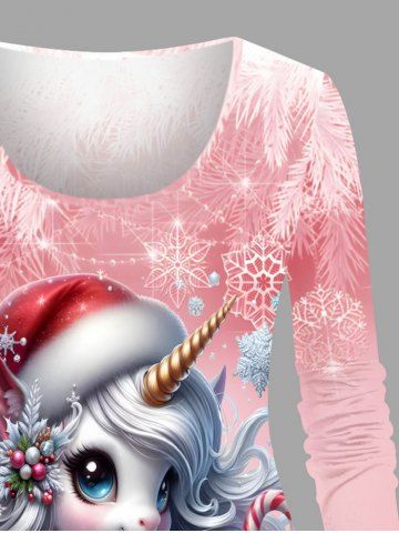 T-shirt à manches longues grande taille avec imprimé licorne, flocons de neige et boules de Noël - Rose Clair - Rose Léger