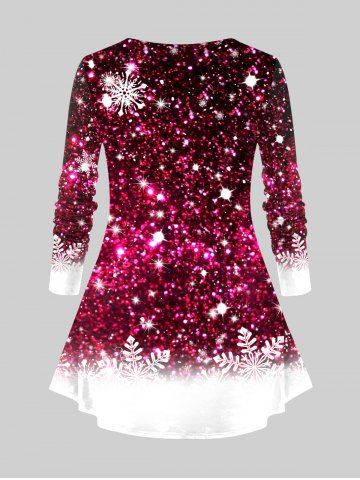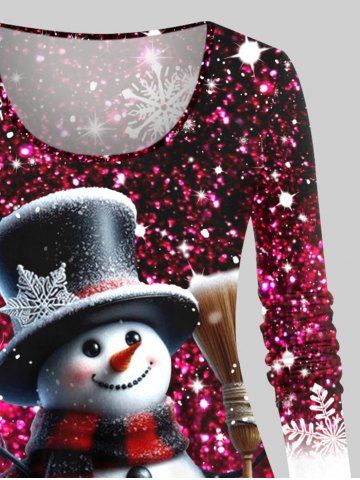 T-shirt de Noël Brillant Bonhomme de Neige et Flocon de Neige Imprimés de Grande Taille à Paillettes - Rouge Foncé - 1x