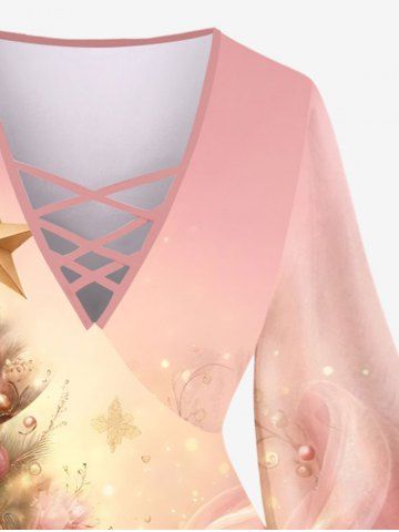 T-shirt grande taille à imprimé sapin de Noël, boule, étoile et nœud papillon, manches évasées croisées. - Rose Clair - Rose Léger