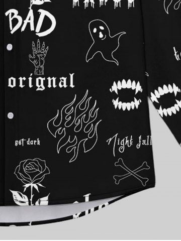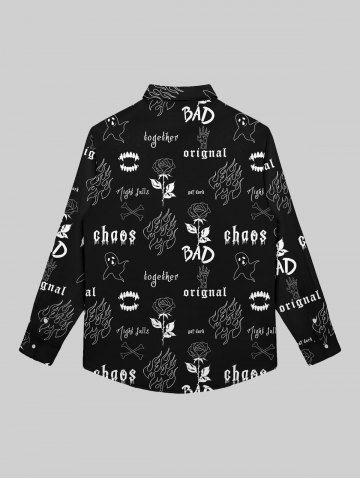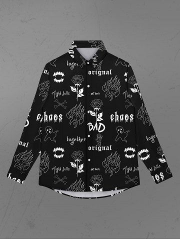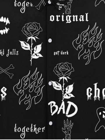 Chemise à Col Rabattu avec Boutons et à Imprimé Roses en Feu et Fantôme pour Hommes - Noir - Noir