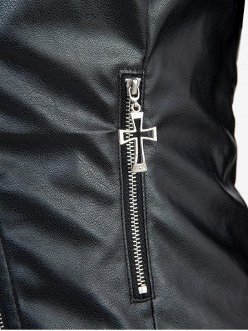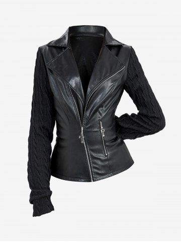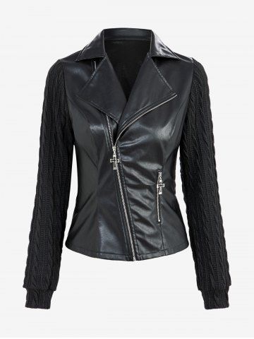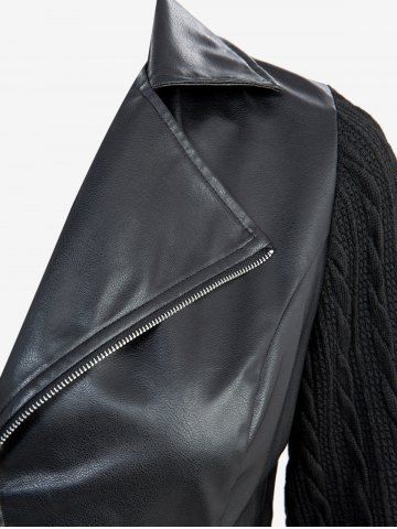 Veste en Tricot à Câble Gothique Jointif Croisé avec Poche en Cuir PU - Noir - Noir