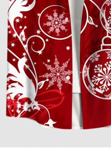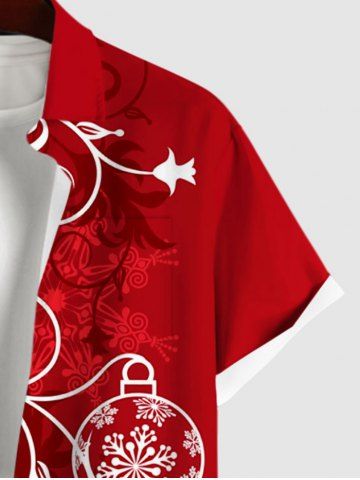 Plus Size Christmas Ball Snowflake Floral Leaf Print Buttons Pocket Shirt For Men - Rouge - Rouge